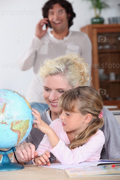 Женщина, помогающая дочери выполнить домашнее задание по географии