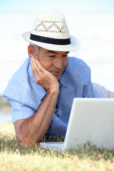 Пожилой мужчина, лежащий в поле с ноутбуком