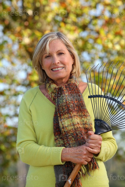 Женщина, сгребающая листья во дворе