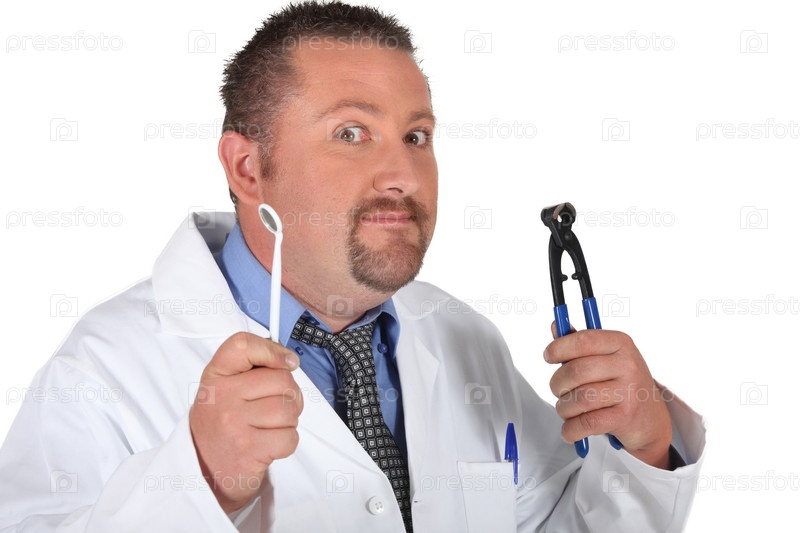 Стоматолог держит зеркало и плоскогубцы