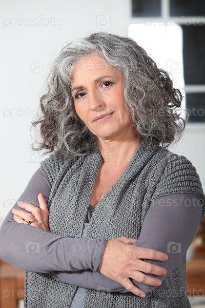 Женщина с седыми волосами стоит на кухне