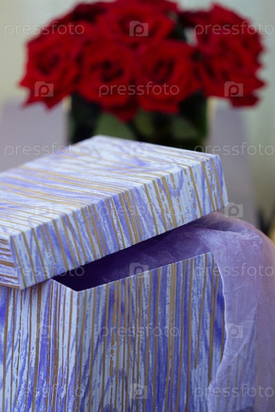 Коробка с подарком на фоне букета красных роз
