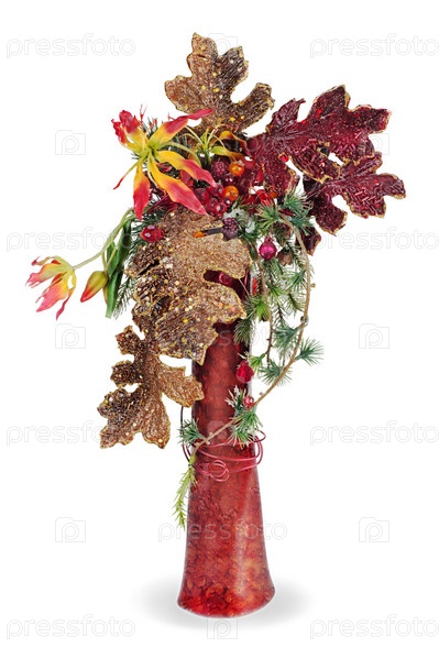 Рождественские шарики, искусственные цветы, бусины и сосновые ветви в вазе, изолированные на белом фоне