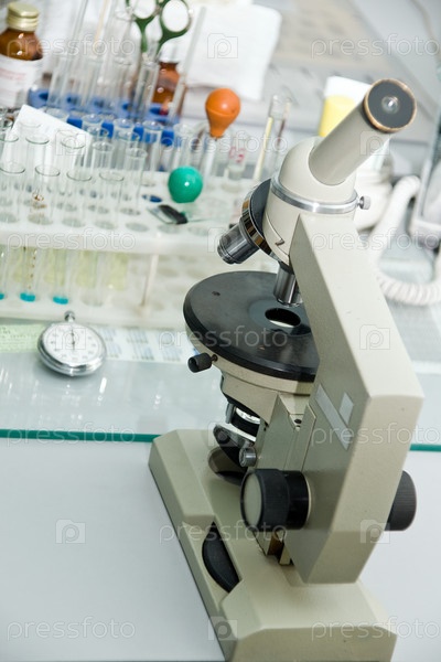 Микроскоп, пробирки, колбы в лаборатории