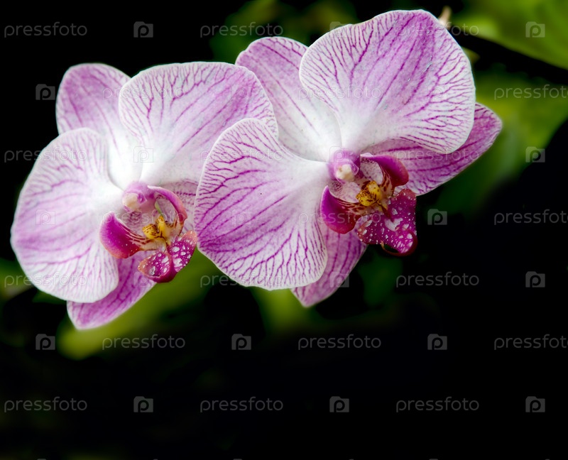 Цветы орхидеи на черном фоне. Белый фаленописис с сиреневыми прожилками