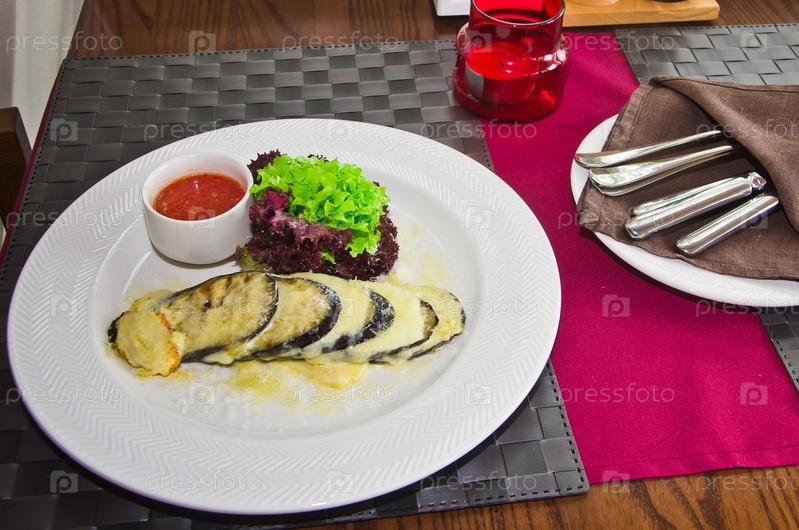 Запеченные баклажаны с салатом и соусом