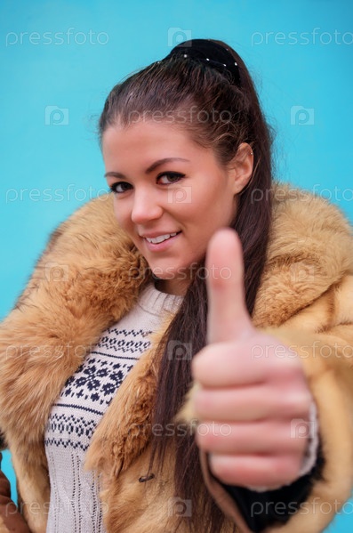 Красивая женщина в шубе, показывающая большой палец вверх