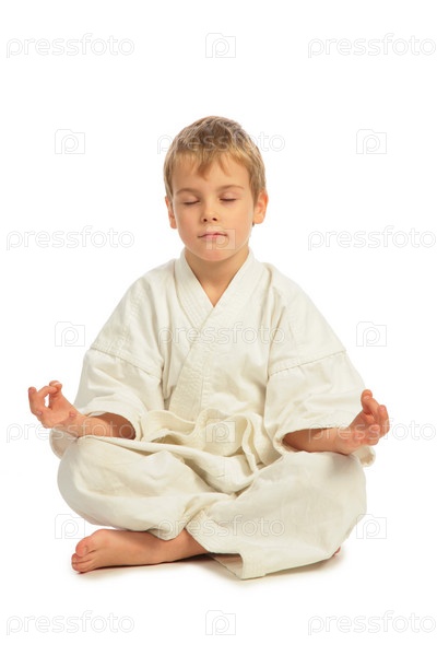 Мальчик медитирует, на белом фоне