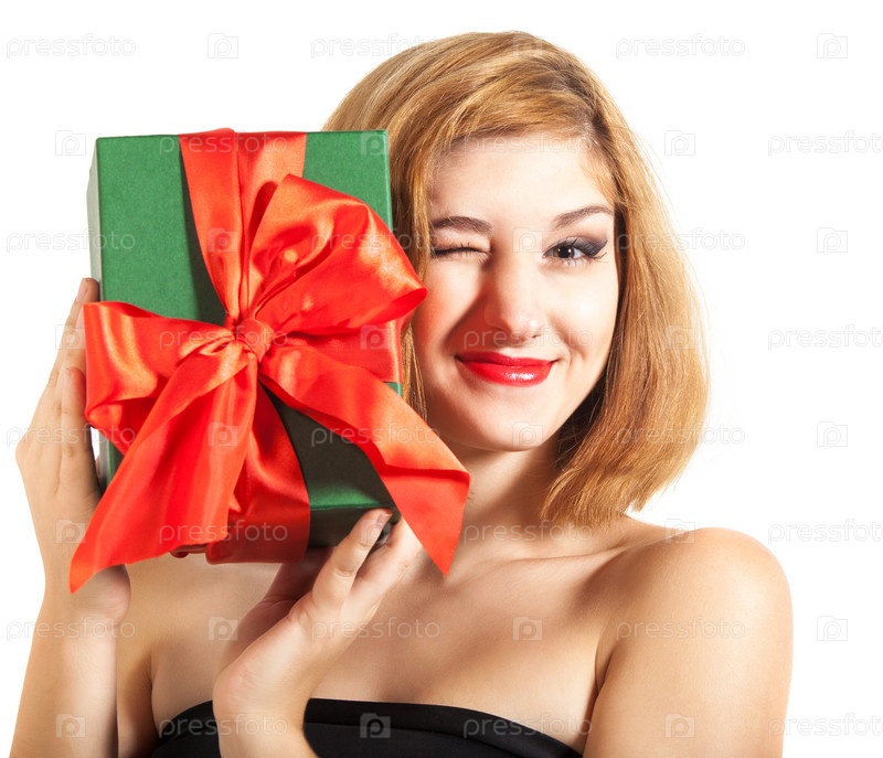 Красивая молодая брюнетка с подарком