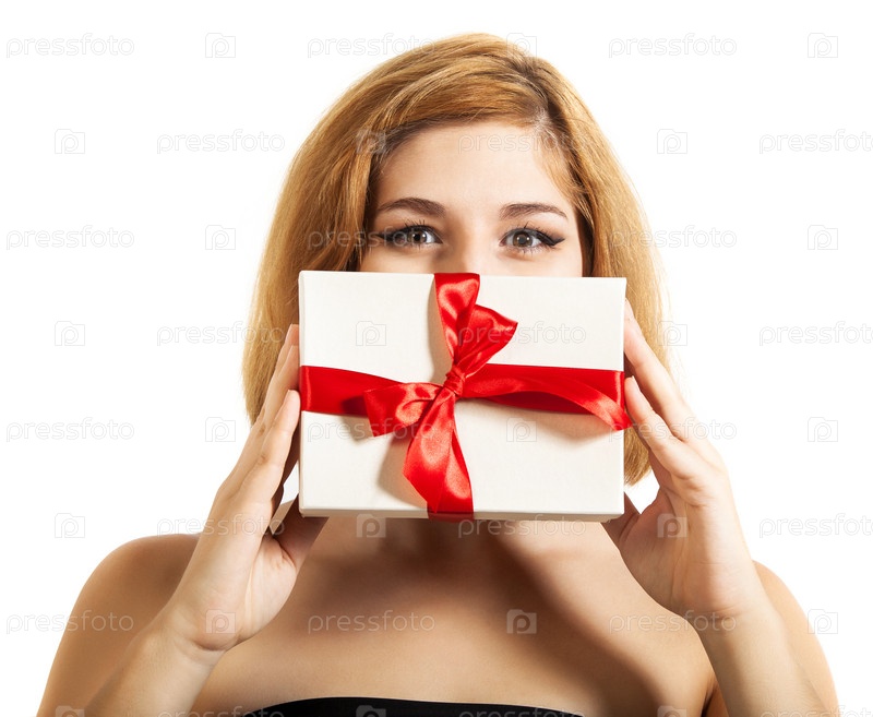 Красивая молодая брюнетка с подарком