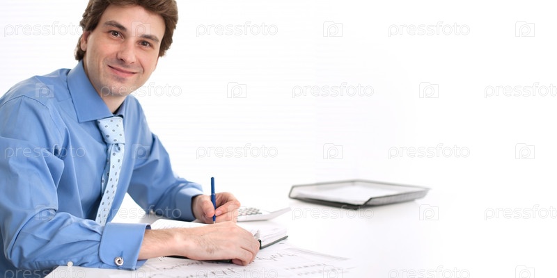 Молодой предприниматель, работающий за столом в офисе