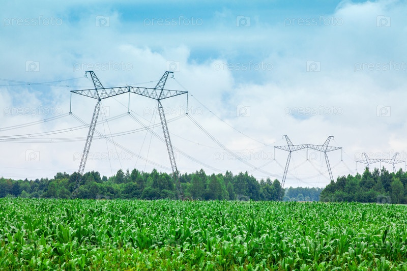 Зеленое кукурузное поле и линия электропередач