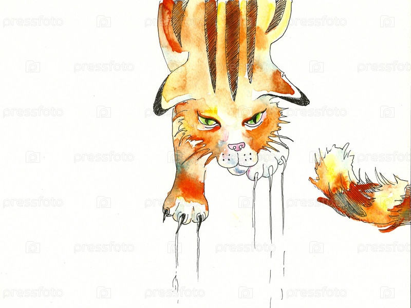 Сердитый рыжий кот окраса тэбби царапает поверхность, акварель