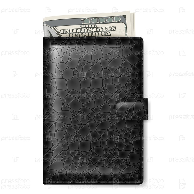 Черный кожаный бумажник с долларами. Иллюстрация на белом