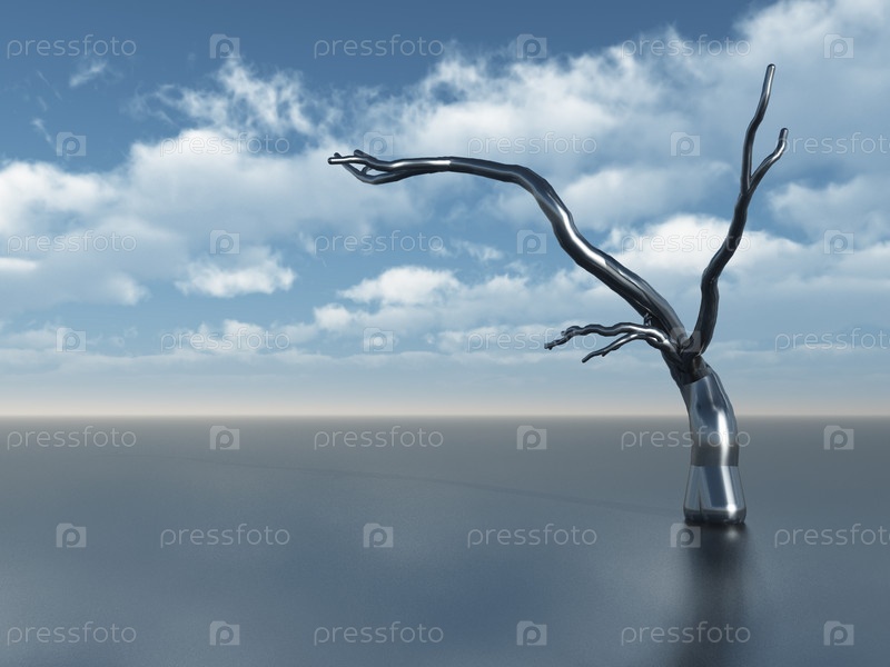 Абстрактное металлическое дерево под облачным небом - 3d иллюстрация