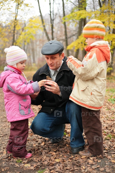 Дед с внуками в осеннем лесу