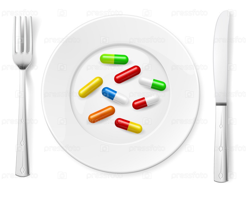 Медицинские таблетки на белом фоне с ножом и ложкой