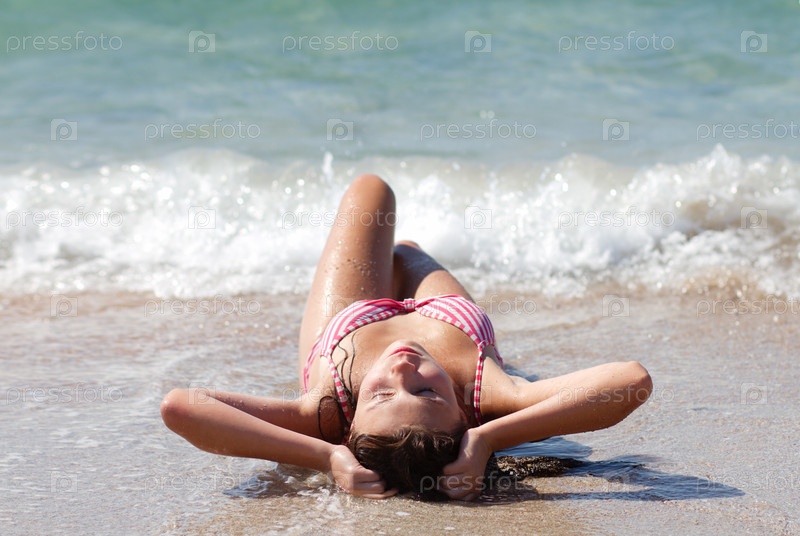 Красивая молодая девушка загорает в волнах