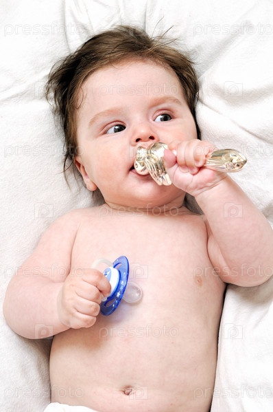 Ребенок с пустышкой и серебрянной игрушкой в постели