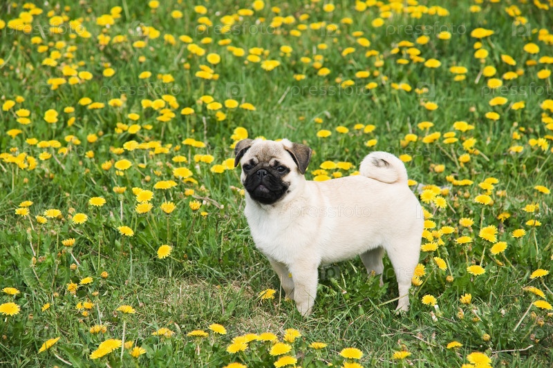 Щенок мопса на поле одуванчиков