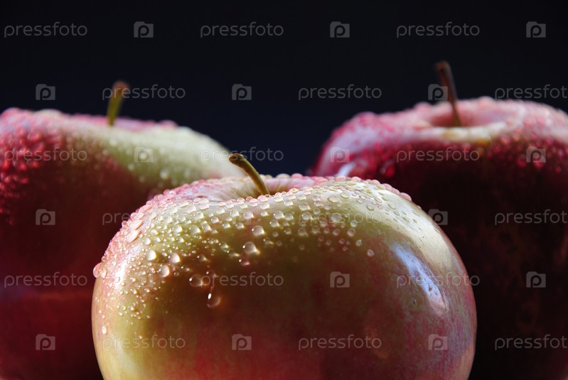 Три яблока с каплями воды на темно-синем фоне