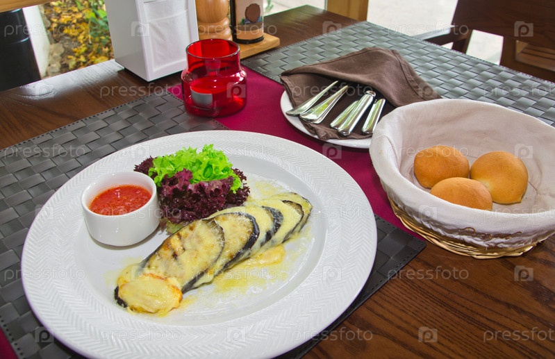 Запеченные баклажаны с салатом и соусом