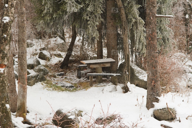 Красивая зима со столом и скамейкой для пикника в снегу в Казахстане, Алматы