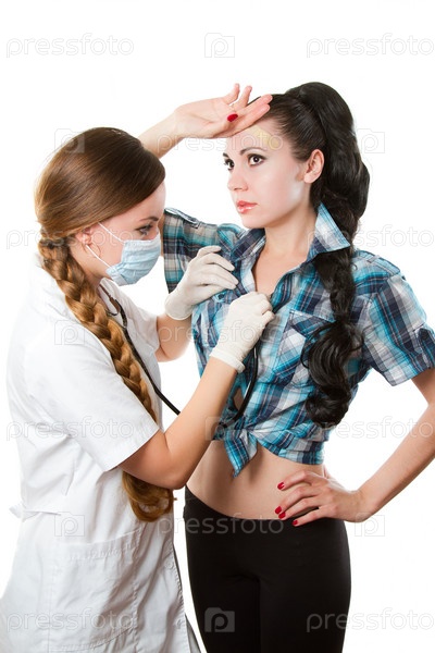 Врач или медсестра слушает стетоскопом молодую пациентку на белом фоне