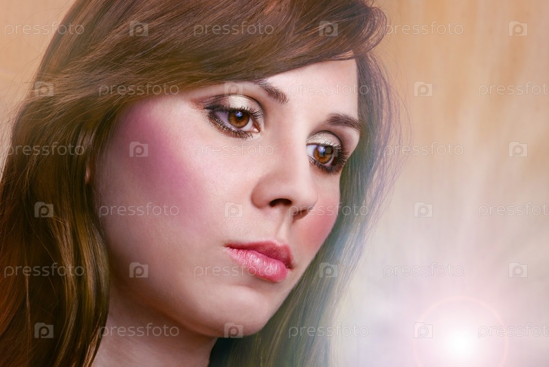 Крупным планом портрет красивой брюнеткм на светлом фоне