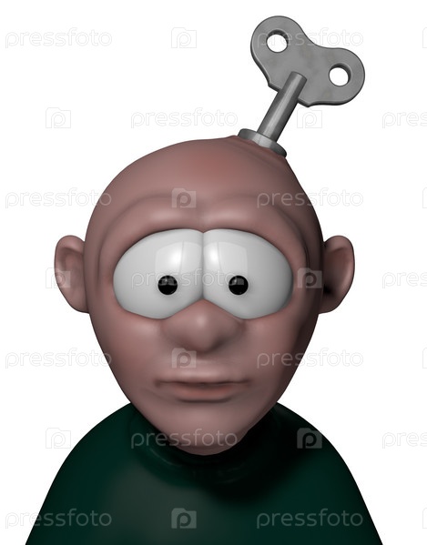 Мультипликационный персонаж с заводским ключом в голове - 3d иллюстрация