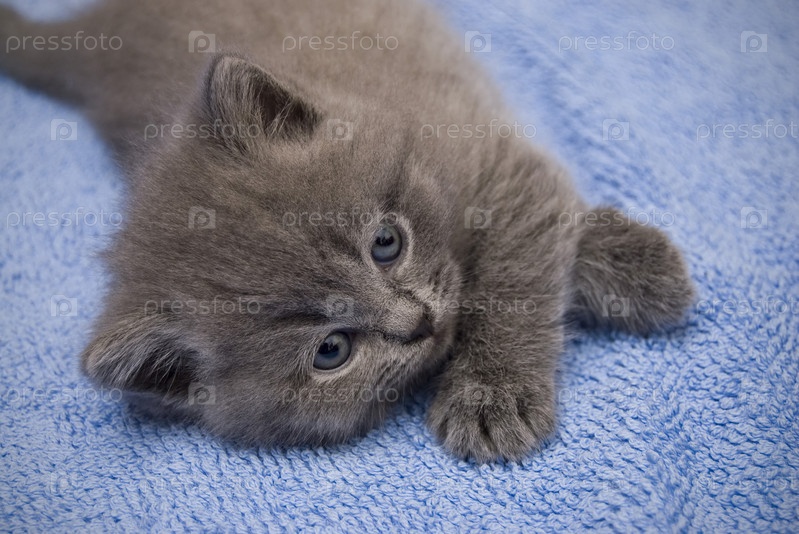 Полуторомесячный котенок породы скоттиш фолд страйт лежит на голубом покрывале