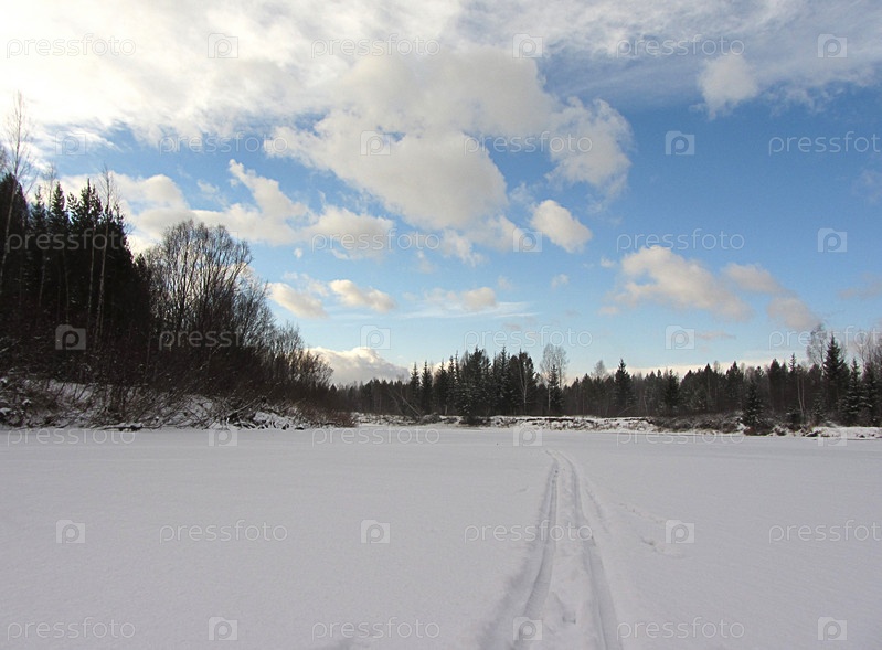 След от лыж посередине замерзшей реки