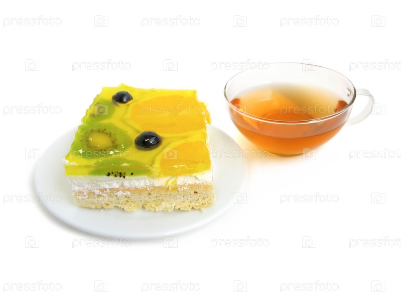 Вкусный торт с фруктами и чай