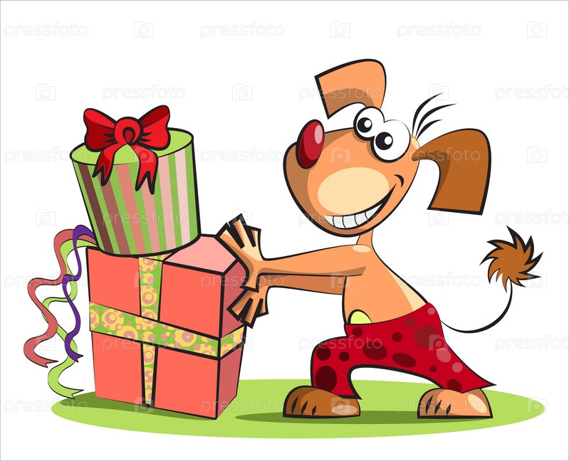 Собака и подарки, изолированные на белом