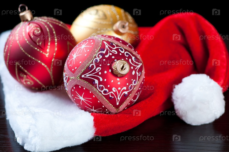 Рождественские игрушки и колпак Санты на черном фоне
