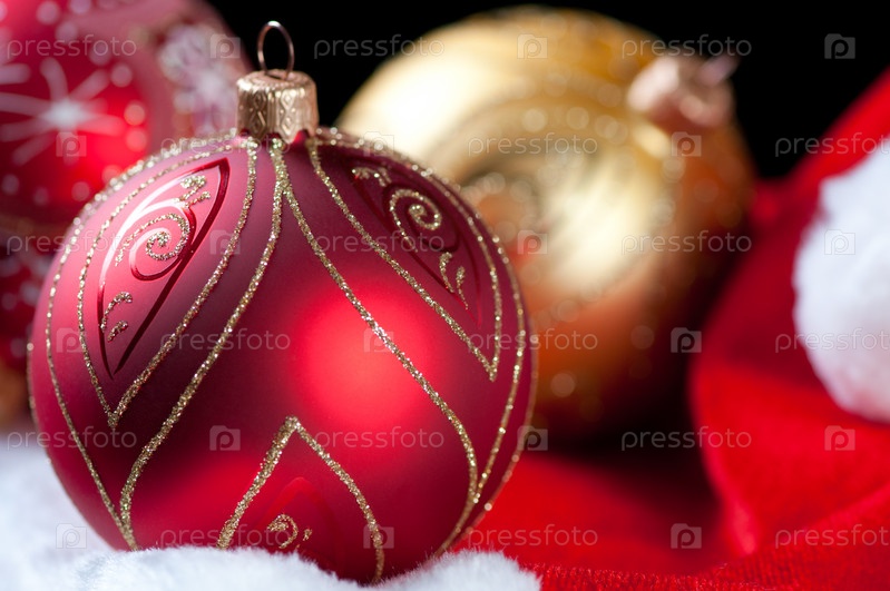 Красочные елочные шары на колпаке Санты крупным планом