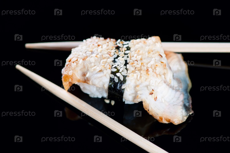 Суши с угрем и палочки на черной тарелке
