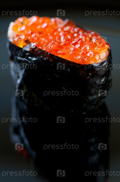 Суши с лососевой икрой, крупный план