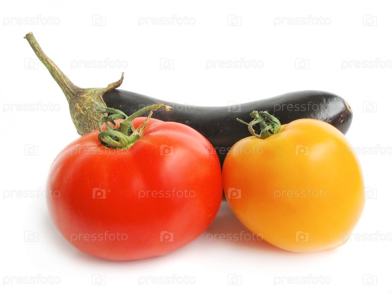 Два помидора и баклажан на белом фоне