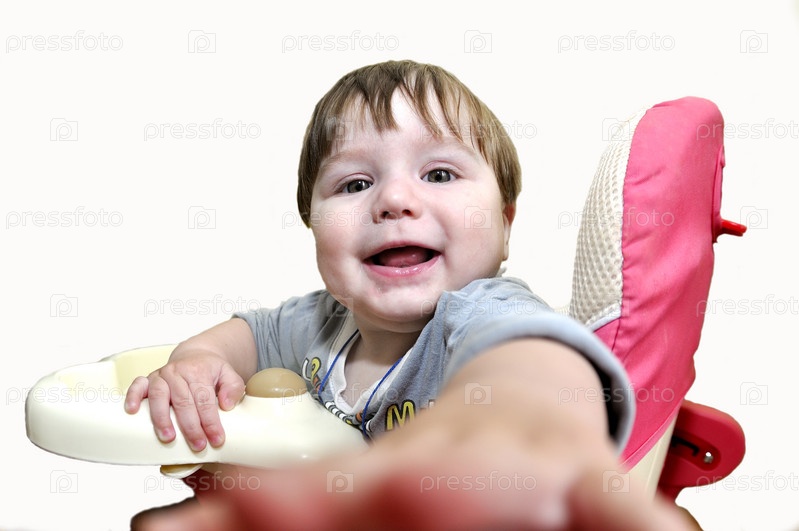 Улыбающийся мальчик сидит на стуле и тянет руку