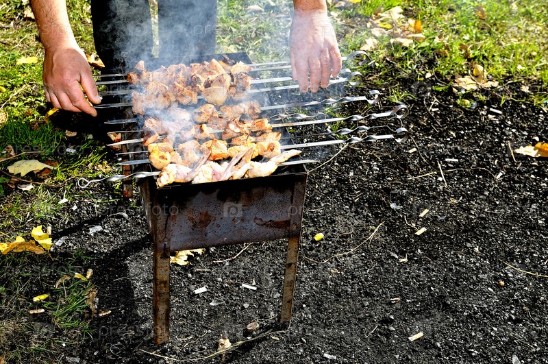 Человек готовит мясо на огне (шашлык)