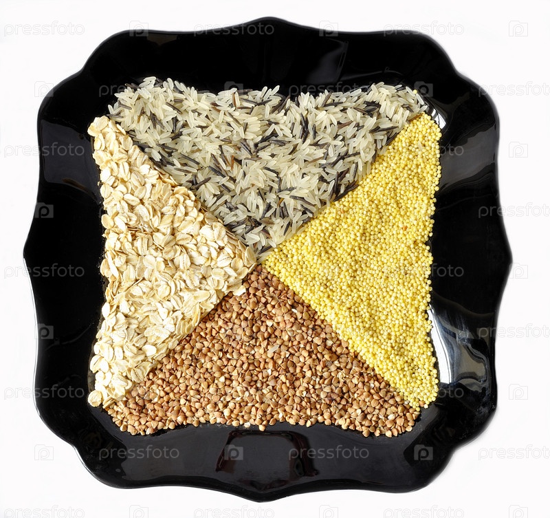 Черная тарелка с рисом, гречихой, просом и овсянкой