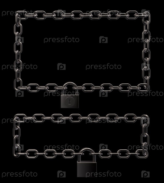Замок на раме из металлических цепей на черном фоне - 3d иллюстрация