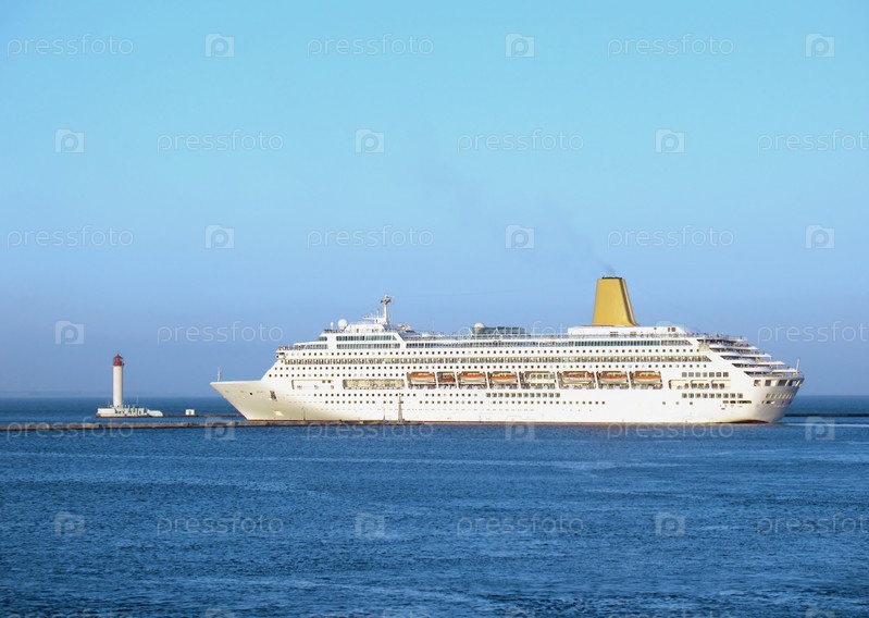 Белый круизный лайнер покидает порт