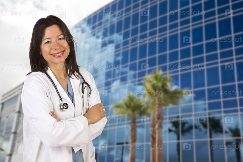 Привлекательная латиноамериканская женщина-врач или медсестра на фоне здания
