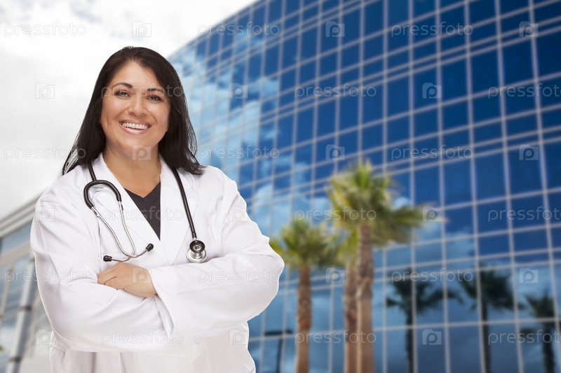 Привлекательная латиноамериканская женщина-врач или медсестра на фоне здания