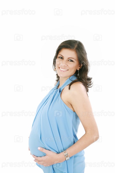 Портрет счастливой беременной женщины с руками на животе, изолировано на белом фоне