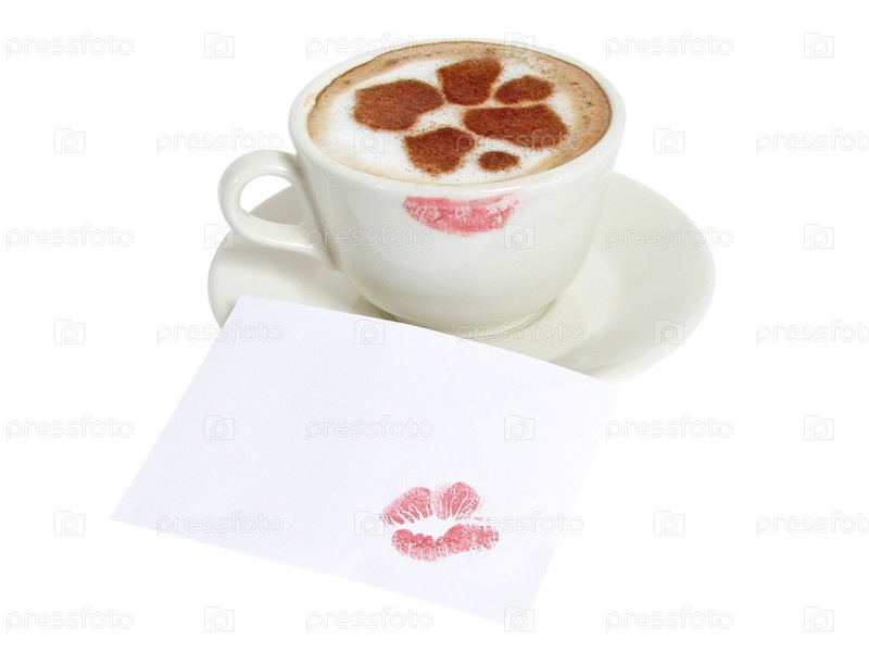 Белая чашака каппучино со следами губной помады на белом фоне