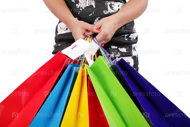 Женщина с пакетами в руках, изолированная на белом фоне. Фокус на руках
