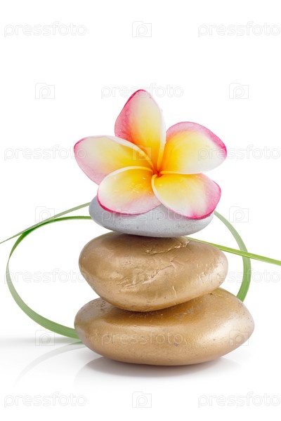 Цветок франжипани на камне с зеленой травой, изолированный на белом фоне